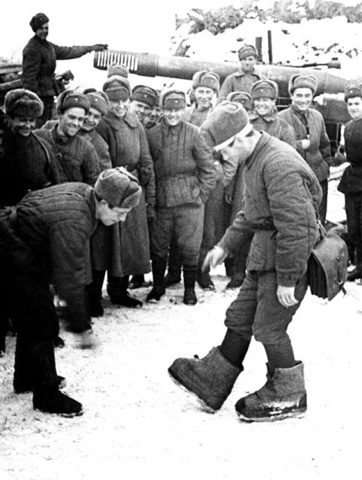 Бойцы Красной Армии демонстрируют в одном из освобожденных районов Сталинграда немецкие эрзац-валенки. Сталинград. 28 ноября 1942 года.