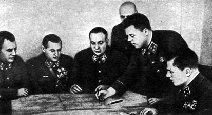 В штабе Донского фронта слева направо: А. А. Новиков, К. К. Рокоссовский, Н. Н. Воронов, К. Ф. Телегин, М. С. Малинин, В. И. Казаков