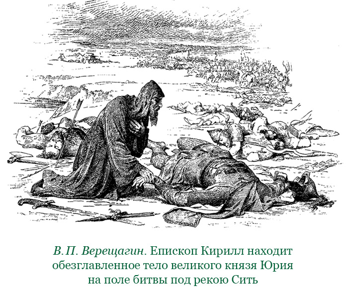 Остальные в ужасе разбегаются. Это было 4 марта, всего несколько дней спустя после взятия Владимира. Ряд курганов по реке Сити с находимыми в них скелетами, носящими следы тяжелых ран, указывает на то, что бежавшие по временам останавливались, пытались отбиваться, снова бежали… Как глухие звуки, доносящиеся из глубины веков, звучат местные названия: Резанино, Станово, Сторожево, Боронишино, Могилицы, Юрьево.