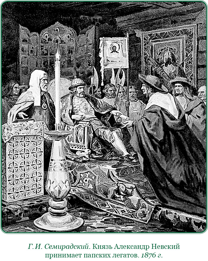 Решительные победы Александра Ярославича принудили наших западных врагов навсегда отказаться от мысли о порабощении Руси наподобие Ливонии. Ни шведы, ни немцы не могли сокрушить доблестного князя. Даже литовцы, проснувшееся мужество которых грозило сделаться опасным даже для соединенных сил двух орденов, приведены в трепет непобедимым героем. Папы увидали, с каким противником они имеют дело, и вот вместо грозных булл, призывавших к крестовым походам против русских наравне с язычниками, папская политика избирает другой путь.