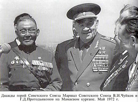 Из воспоминаний маршала В. И. Чуйкова: «Трудно забыть героическое прошлое артиллерийского снайпера-бронебойщика Протодьяконова. По национальности он – якут, рослый и сильный физически. Он один остался из всего расчета со своей 45-миллиметровой пушкой между траншеями нашими и противника, в лощинке на северном скате Мамаева кургана. Он так хорошо маскировался, что танкисты противника узнавали об этой пушке тогда, когда уже или горели, или были подбиты.