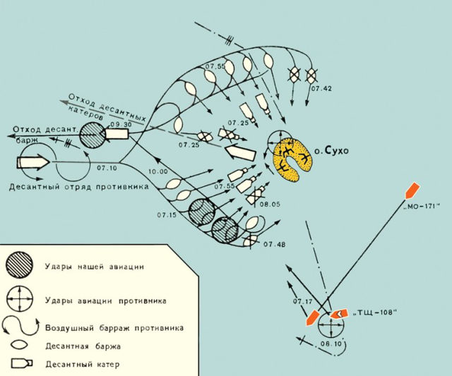 Обстановка накалилась до предела. Командир батареи был еще раз ранен, на этот раз тяжело. Его место занял главстаршина И. И. Мартынов. Он несколько раз поднимал бойцов в контратаки. В это время над островом появились наши самолеты. Они начали с ходу штурмовать десантные суда. К Сухо подошли также два отряда наших кораблей, состоявшие из канонерских лодок, бронекатеров и тральщиков. Не выдержав удара, враг начал поспешно уходить, преследуемый советскими самолетами и кораблями.