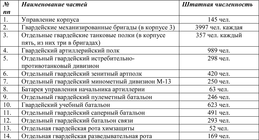 Перечень частей и штатная численность 1-го и 2-го гвардейских механизированных корпусов