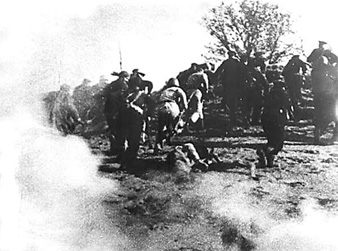 Под прикрытием дымовой завесы солдаты и матросы идут в атаку
