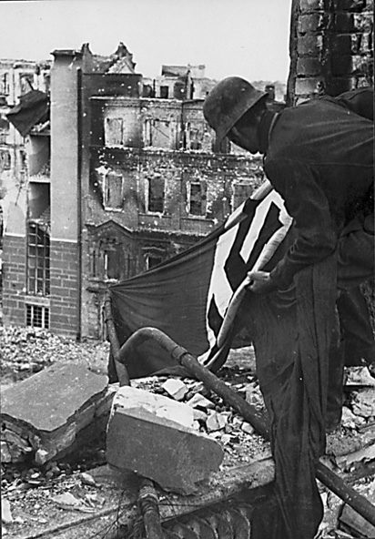 Немецкий солдат закрепляет флаг на захваченном здании Сталинграда
