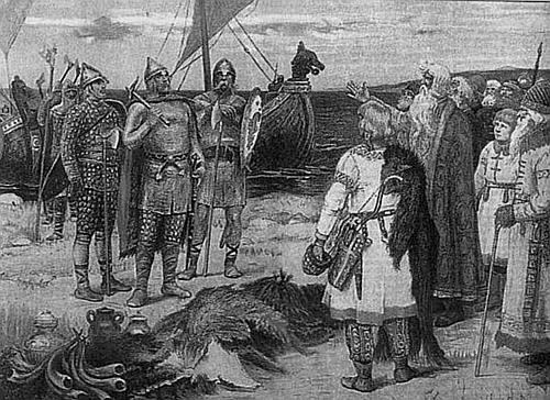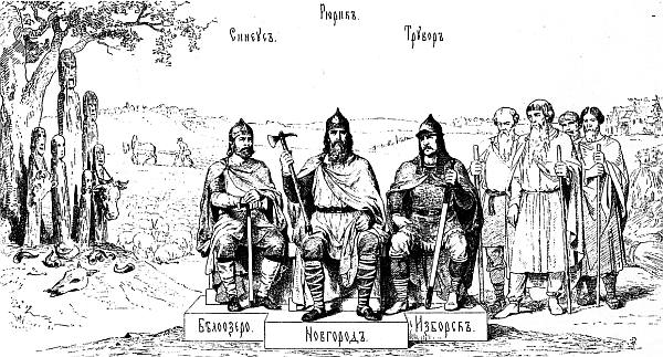 Много споров вызвала фигура Рюрика, которого объединение ильменских славян позвало на княжение в Новгород в 859 г. для завершения борьбы за верховенство в Новгороде, а также – для защиты от переселяющихся с Урала угро-финнов и ватаг воинственных скандинавов. Около 862 г. конунг Рюрик со своей дружиной прибывает в Новгород, где насаждает собственное единоначалие. Согласно летописи, Рюрик умер в 879 г., оставив сына – малолетнего Игоря. Власть же принял воевода по имени Хельги (Олег), которое переводится со скандинавского как «колдун», «вождь». Будущий Олег вещий с Игорем и дружиной двинулся по великому пути «из варяг в греки». В 882 г. варяги подошли к Киеву, где стояла небольшая дружина Аскольда, убили Аскольда и вождя славян Дира и захватили Киев, тем самым объединив Новгородскую и Киевскую Русь. Этот год стал годом основания Древнерусского Киевского государства.