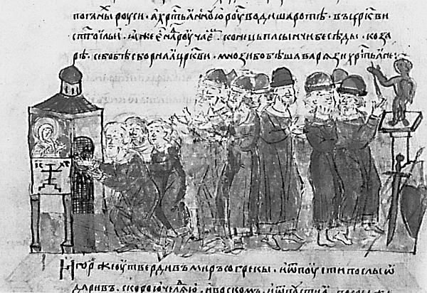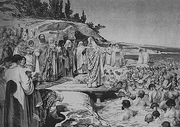 Сын Святослава – Владимир – в 988 г., с целью укрепить свои отношения с Византией, принял христианство, расправился со старыми богами и крестил толпы своих подданных в Днепре.