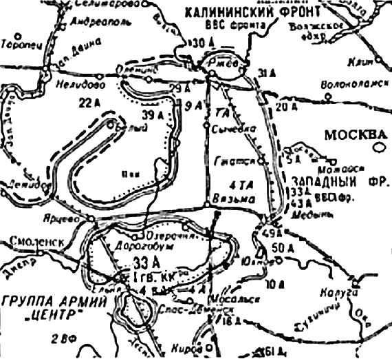 В конце января 1942 г. в результате наступления советских войск линия фронта на центральном участке советско-германского фронта была очень извилистой и образовывала выступы то в глубину немецкой обороны, то в линию фронта советских войск. Так, войска советских 3-й и 4-й ударных армий продвинулись до Холма, Демидова и Велижа, а войска немецкой группы армий «Центр» глубоко вклинились в расположение советских частей в районах Белого, Ржева. Линия фронта проходила здесь западнее Белого, севернее Оленино, севернее и восточнее Ржева, восточнее Зубцова, Гжатска, до марта 1942 г. восточнее, а затем западнее Юхнова (схема 1)[1].