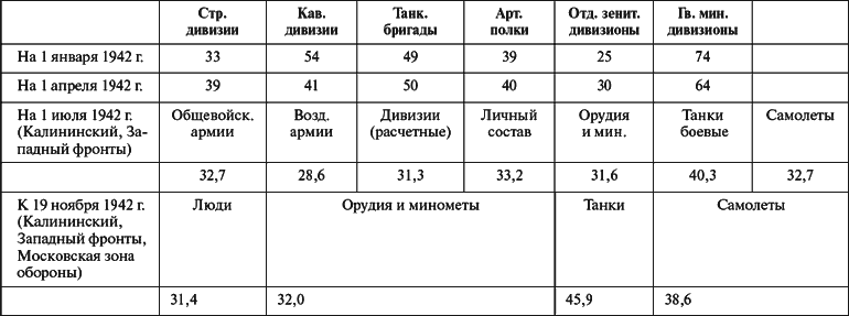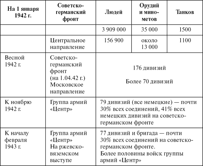 Таким образом, в первой половине 1942 г. перед Москвой был создан оборудованный плацдарм немецких войск, который командование вермахта, планируя использовать для наступления на центральном стратегическом направлении Восточного фронта, постоянно укрепляло и упорно удерживало весь 1942 г. Для того чтобы устоять под натиском войск Западного и Калининского фронтов в 1942 г., командование вермахта сосредоточило на центральном участке советско-германского фронта, в том числе в районе выступа, до трети всех сил, находившихся на Восточном фронте (таблица 1).