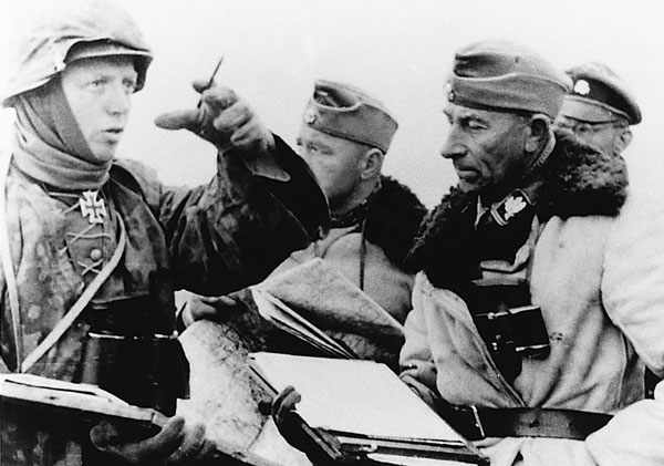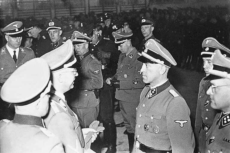 Оберстгруппенфюрер СС и генерал-полковник войск СС Пауль Хауссер (справа), бывший в довоенное время генеральным инспектором войск особого назначения СС. На этом снимке он сфотографирован вместе с оберштурмбаннфюрером СС Фрицем Клингенбергом