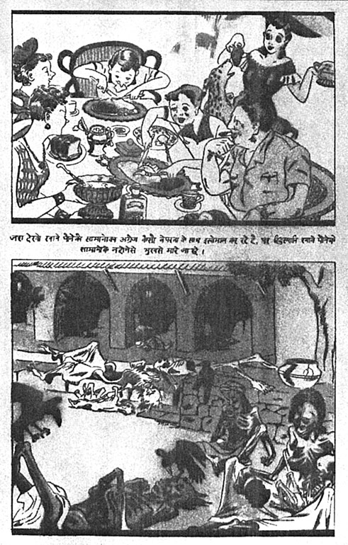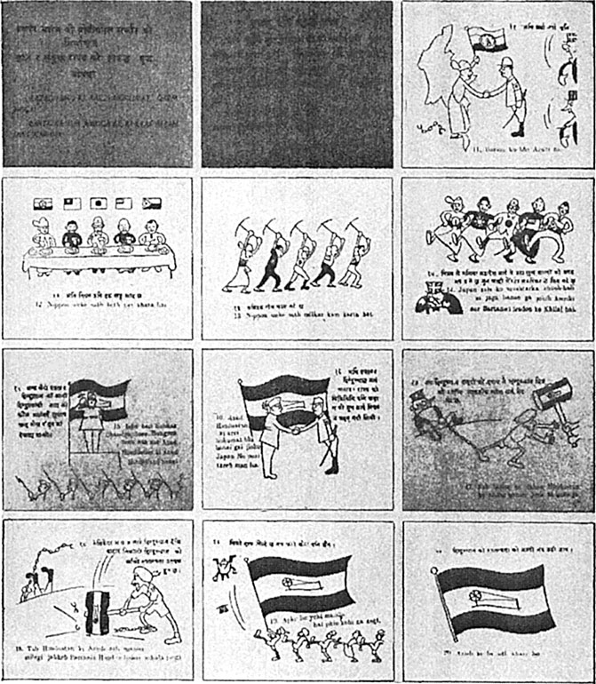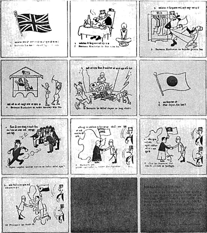 Пропаганда приобрела в годы Второй мировой войны огромную аудиторию. Наиболее интересные изобретения в этом плане были сделаны сотрудниками Индийской радиовещательной компании и их японскими конкурентами. На изображенных здесь рисунках рассказана история на языке хиндустани (она записана буквами деванагарского алфавита) или на романизированном хиндустани. Брошюра предназначалась для индусов, которые могли читать обе формы шрифта, а картинки были нарисованы для неграмотных. Она начинается с изображения британского флага и заканчивается флагом конгресса, который был знаменем марионеточного прояпонского правителя Индии Субхаса Чандры Боса.