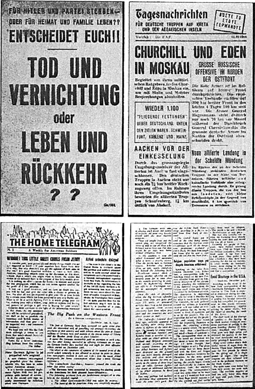 Новости – один самых эффективных методов психологической обработки врага. Одна из этих газет выпускалась для немецких войск, оккупировавших Эгейские острова; вторая – немцами для американцев во Франции. Из них обеих газета союзников [на немецком языке] делалась более профессионально. Обратите внимание, как отделяются обращения от статей, как отделяются друг от друга колонки новостей, а также на указание вверху, сделанное на греческом языке, что эта газета предназначена для немцев.