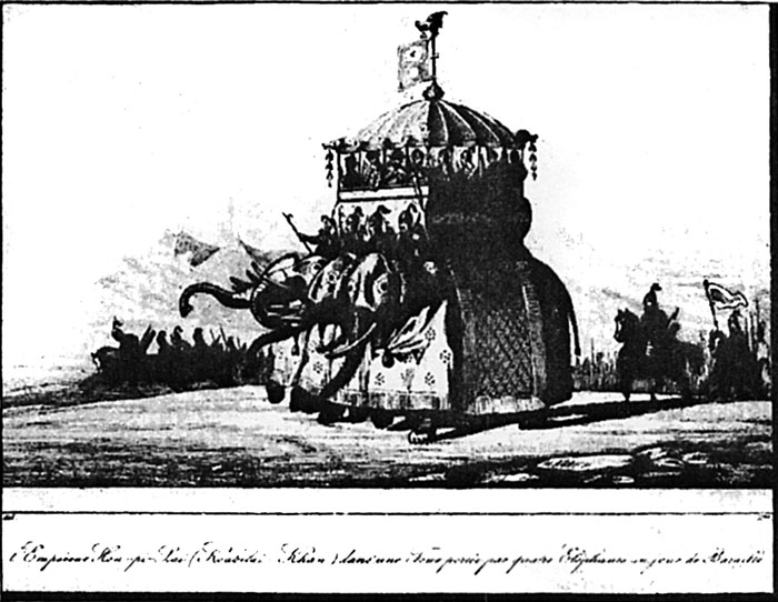 Рис. 8. СЕКРЕТНОЕ ОРУЖИЕ МОНГОЛОВ Чтобы облегчить себе завоевание других народов, монголы использовали слухи и страх. Придя к власти, они для подавления воли покоренных народов к сопротивлению широко применяли демонстрацию силы. На этой французской гравюре изображен военный отряд на спинах четырех слонов. Предполагается, что таких чудищ использовал Хубилайхан, правнук Чингисхана и друг венецианского купца Марко Поло. Конечно, использовать такое сооружение в бою было невозможно, но оно очень подходило для демонстраций во время парадов, и само упоминание о нем было фактором проводимой монголами психологической войны.