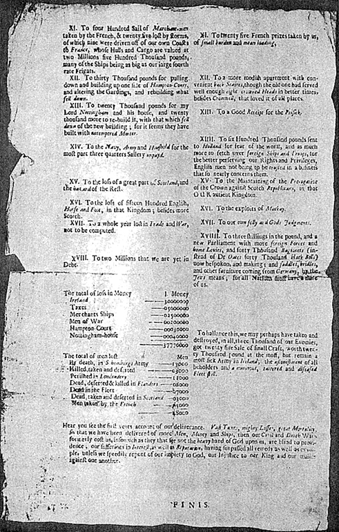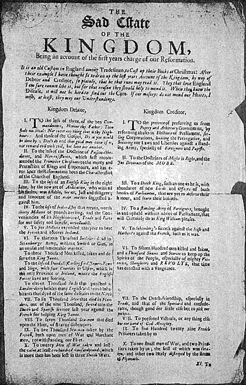 Когда Вильгельм Оранский отобрал у застенчивого негодяя Иакова II английскую корону, он столкнулся с оппозицией роялистов, которая осталась преданной Стюартам. Этот плакат относится к ранней форме черной пропаганды. Он также служит примером расположения материала в хорошо знакомой читателю форме – в виде купеческой таблицы дебета и кредита.