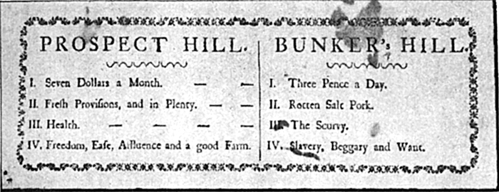 Такие листовки разбрасывали во время битвы при Банкер-Хилл. Эта листовка оказалась бы действенной и в наши дни. Никто не знает, кто ее создал, никто, однако, не утверждал, что это фальшивка. В современной терминологии такие листовки называют «серой» пропагандой. Дезертирам в ней обещают богатство, пищу, здоровье и высокий экономический статус. Сложные политические проблемы не обсуждаются – о них просто не говорят.