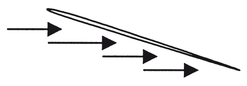 Самолеты летают по воздуху. Воздушные шары, наполненные легким газом, плавают в воздухе – как поплавок в воде. Парашюты и осенние листья медленно опускаются на землю, опираясь на воздух. А самолеты непрерывно «наезжают» на воздух своими крыльями, установленными под небольшим углом к вектору скорости воздушного потока. Этот угол в аэродинамике называется «угол атаки» – выражение, очень любимое журналистами. Нам же с Вами важно понять и запомнить, что «угол атаки» – это вовсе не угол наклона траектории полета по отношению к горизонту (т. е. не угол пикирования или кабрирования), а угол наклона крыла к невидимому и абстрактному «вектору скорости потока». (См. рис. 1)