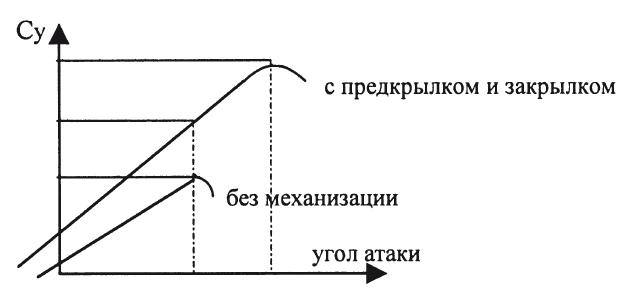 Эти устройства позволяли кратковременно (на момент взлета-посадки) увеличить кривизну профиля крыла, увеличить площадь крыла (выдвижные закрылки) и максимально допустимый по условиям срыва потока угол атаки (этот эффект обеспечивают предкрылки). (См. рис. 4)