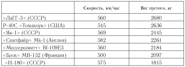 Приведем еще один показательный пример. На рубеже 30 – 40-х годов разрабатывался и поступал на вооружение ВВС ведущих стран мира ряд истребителей с двигателями мощностью 1050–1100 л.с. При почти одинаковых мощности двигателя и максимальной скорости вес этих самолетов оказался очень даже разным (см. Таблица 1).