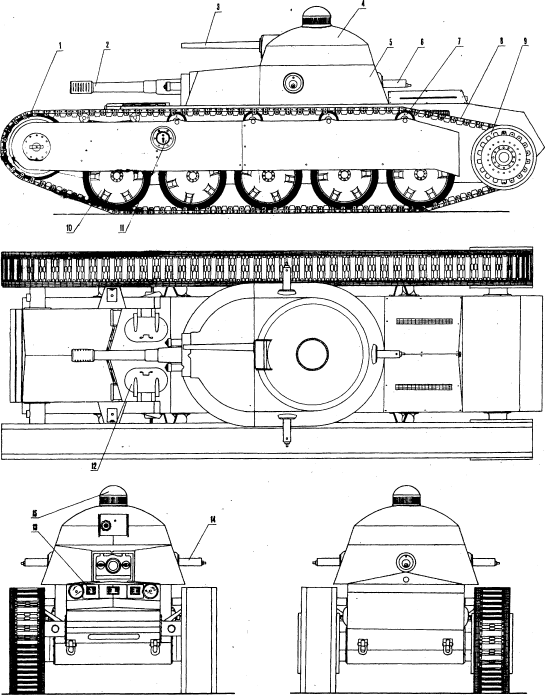 1 – направляющее колесо; 2 – 76-мм пушка; 3 – 37-мм пушка; 4 – вращающаяся башня; 5 – неподвижная рубка; 6 – кормовой пулемет «максим»; 7 – поддерживающий каток; 8 – гусеничная цепь; 9 – ведущее колесо; 10 – опорный каток; 11 – бортовая установка пулемета ДТ; 12 – люк для посадки экипажа; 13 – смотровой прибор механика-водителя; 14 – бортовой пулемет «максим»; 15 – стробоскоп