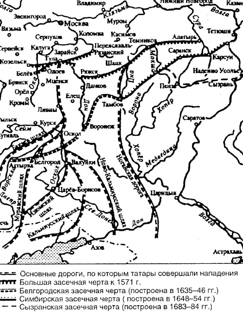 С 1580 г. по 1590 г. русские строят южную линию городов-крепостей – Белгород, Воронеж, Валуйки, Елец, Кромы, Курск, Лебедянь, Ливны, Оскол, Царев-Борисов. Города-крепости соединялись между собой малыми укреплениями и «засечными чертами». «Засечные черты» представляли собой в 100 метров шириной полосы поваленных верхушками на юг деревьев, укрепленные валами. Вдоль всей черты располагались дозорные вышки и укрепленные пункты – остроги. Эти меры в известной степени ослабили набеги татар, прорывы крымцев к Оке стали редкостью.
