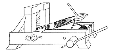 Катапульта, метательная машина, приводимая в действие силами упругости скрученных волокон (сухожилий, волос, ремней и т. и.), предназначалась для метания по крутой траектории камней, ядер, стрел и других физических тел массой 30—480 кг на дальность 250–850 м.