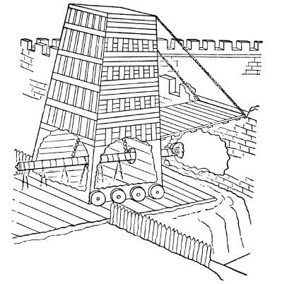 Баллиста также приводилась в действие силой упругости скрученных волокон, но предназначалась для разрушения стен и поражения защитников крепостей. Дальность метания камней (до 30 кг), тяжелых стрел, бревен (длиной до 3,5 м), окованных железом, бочек с горящей смолой достигала 400–800 м, более легких стрел – до 1000 м.