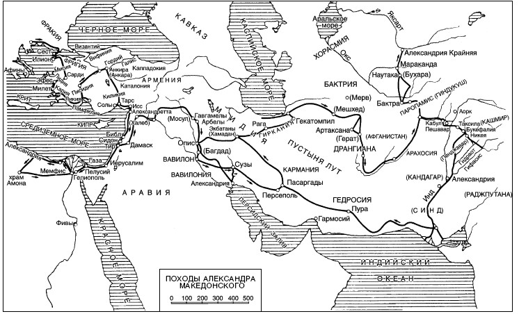 329. Окончательное покорение Центральной Азии. Через Парфию и Бактрию Александр отправился на восток. Захватив и казнив Бесса, он повернул на север и, форсировав реку Оке, вторгся в Согдиану (Узбекистан) и занял ее столицу Мараканду. На берегу реки Яксарт он основал город Александрию Крайнюю. По пути он выдержал ряд сражений со скифскими племенами и в двух из них был ранен. Блестящей операцией считается его переправа через Яксарт с помощью сшитых из палаточного полотна мешков, для придания плавучести набитых сеном. Скифские лучники были отогнаны огнем метательных орудий, прикрывавших переправу. Разгромив скифов, Александр вернулся в Согдиану, восставшую под руководством бывшего сатрапа Спитамена.