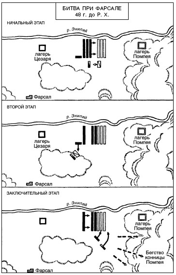 Закончив построение войска, Цезарь отдает приказ двум первым линиям пехоты начать атаку против стоявшей неподвижно армии Помпея. В момент, когда пехота Цезаря наносила удар, Помпей обратил свою кавалерию, действовавшую при поддержке лучников и пращников, против небольшого отряда всадников Цезаря. Всадники Цезаря отчаянно сражались, но ничего не могли поделать с численным перевесом противника. Когда наступил решающий момент, Цезарь лично возглавил избранные шесть когорт во время атаки против фланга наступавших всадников Помпея. Цезарь рассеивает войско неприятеля, не ожидавшее удара, и продолжает упорное наступление; уничтожив лучников и пращников, он вступает в схватку с левым флангом армии Помпея. После этого Цезарь, во главе третьей линии, проходит в промежутках между когортами первых двух и наносит удар по фронту легионов Помпея. В результате внезапной атаки Цезаря и предпринятого его шестью когортами охвата сопротивление Помпея было сломлено. Армия Помпея бежала в лагерь. Не давая войску передышки, Цезарь начинает преследование противника и штурмует лагерь; и здесь он не позволяет воинам приступить к грабежам, вместо этого по пятам преследует противника. В панике Помпей бежит; добравшись всего лишь с тридцатью всадниками до побережья, он переходит на корабль и плывет в Египет.