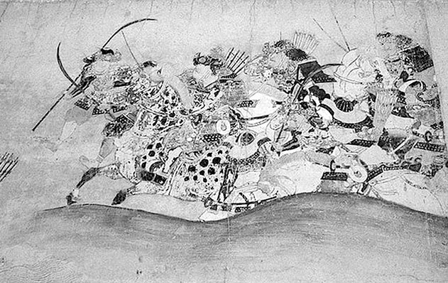 Японские всадники устремляются в бой. Старинный японский рисунок. Токийский национальный музей