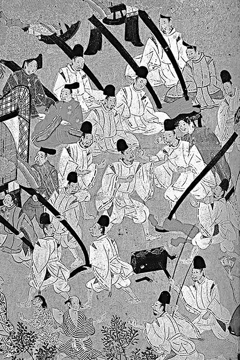 Иллюстрация к Гэндзи-моногатари: потасовка между слугами. Оружия у них нет, но это только пока…