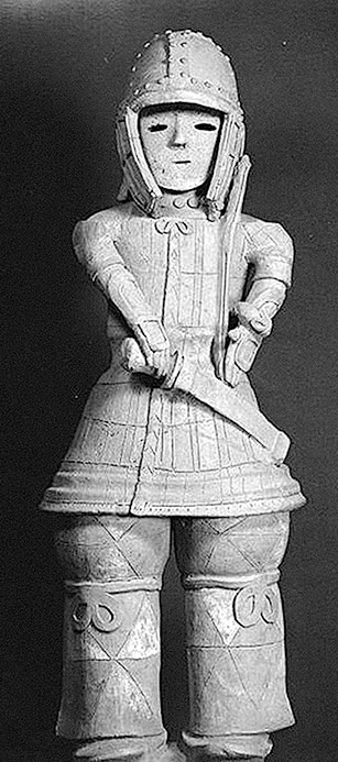 Фигурка ханива, изображающая воина с мечом за поясом.