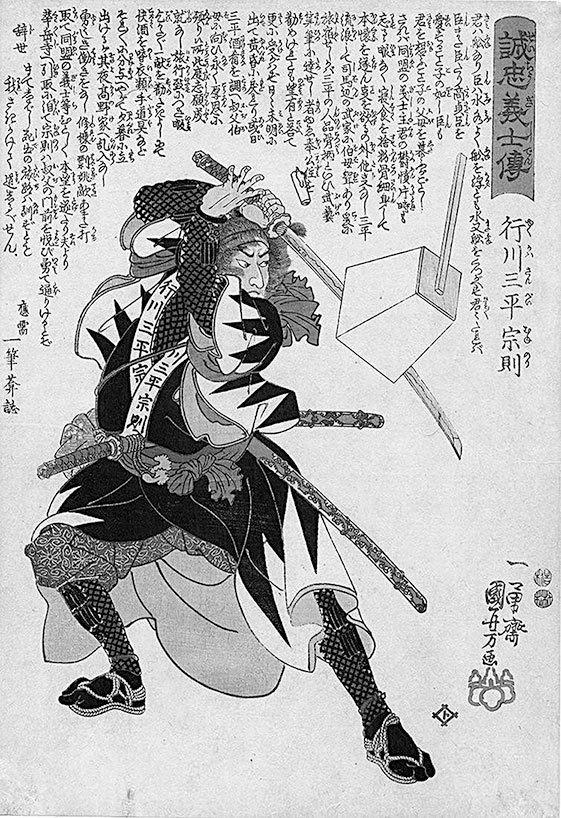Юкугава Мурэнори рубит мечом переносную лампу. Во время боя в доме Кира слуги последнего бросали в атаковавших их самураев-мстителей все, что попадалось им под руку, включая светильники.