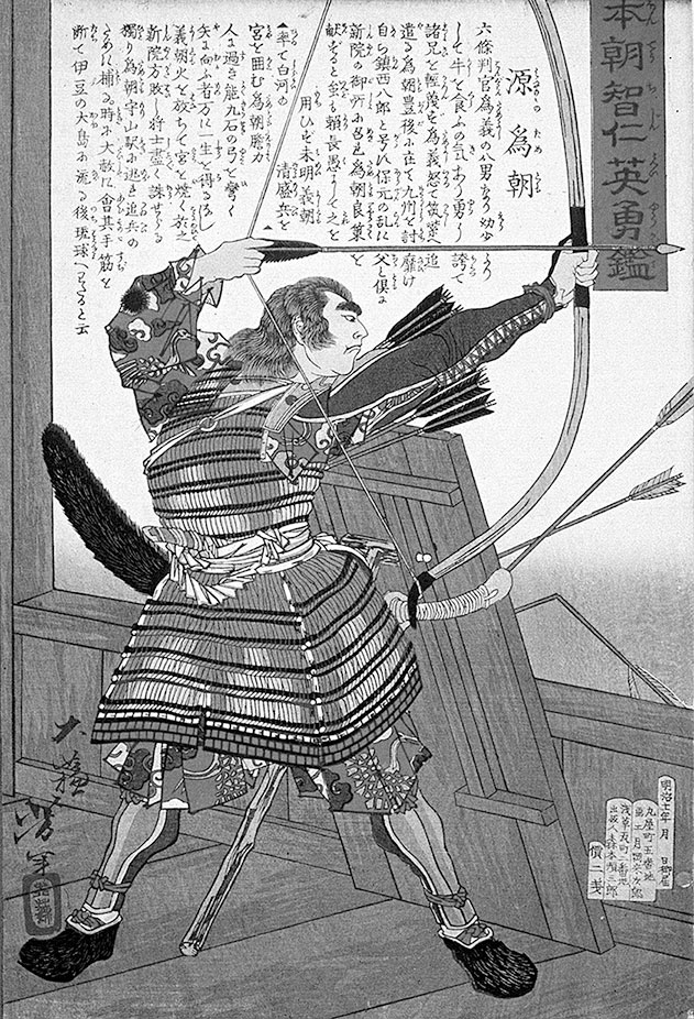 Самурай стоит за станковым щитом и стреляет из лука. Ксилография Цукиока Ёситоси (1839–1892). Окружной музей искусств Лос-Анджелеса.