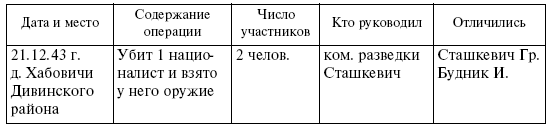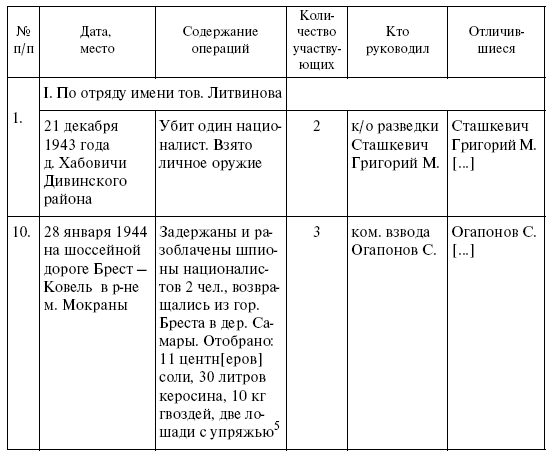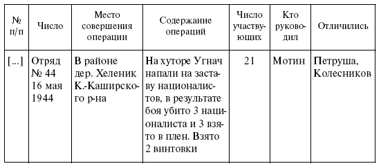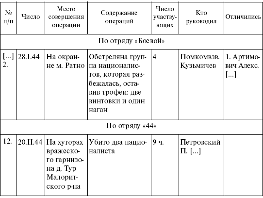 […] С 13 по 16 января 1944 г. Отряд в количестве 60 % выехал на боевую операцию против репрессий украинских националистов, которые заняли г. Камень-Каширск и укрепились в нем, продолжали жестокие репрессии против актива партизан, жителей данного города, в том числе поляков. Город был занят украинскими националистами по мирному договору с немцами, которые сдали город и даже склады с вооружением и боеприпасами.