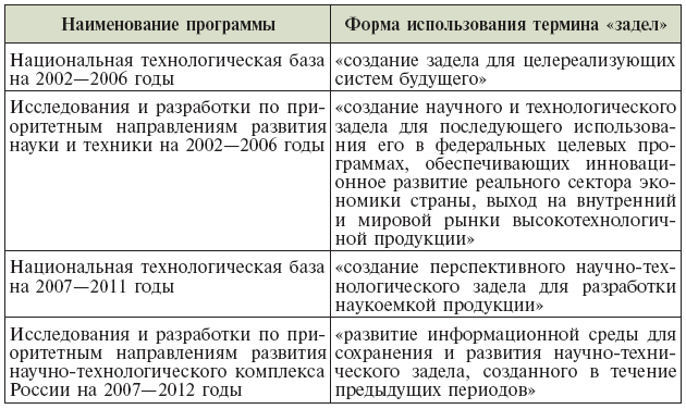 Таблица 1.1. Примеры использования термина «задел» в российских программах развития науки и техники