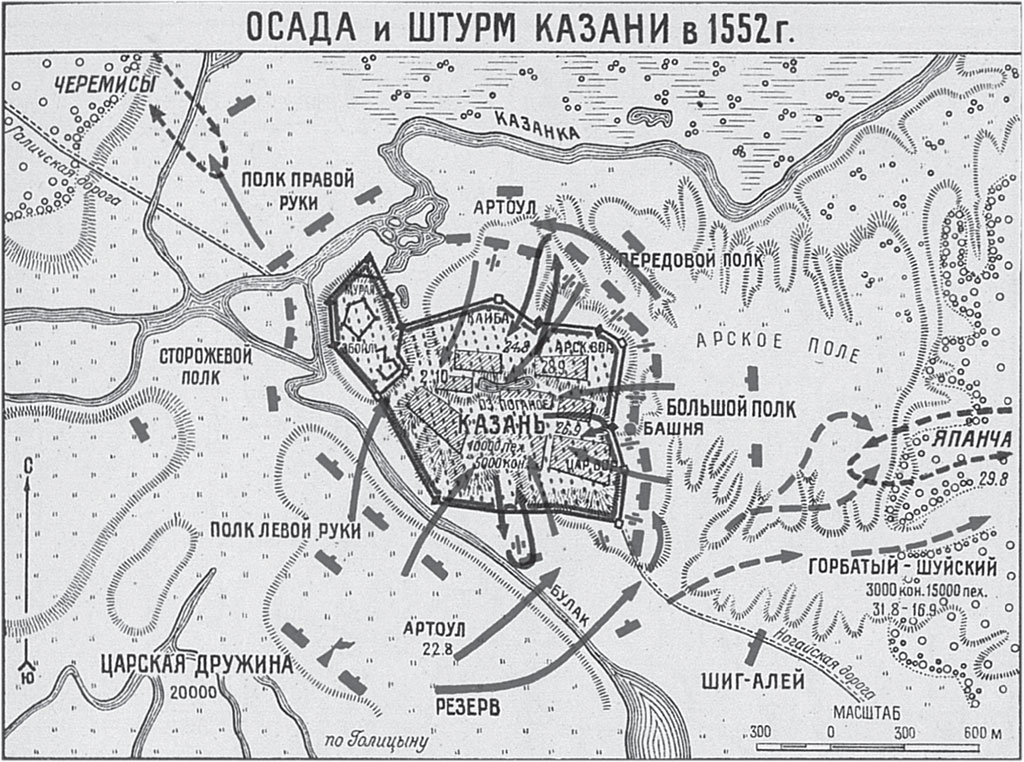 На этот раз татары не ограничились укреплением своего главного города. В 15 верстах к северо-востоку от Казани, в верховьях реки Казанки, на Высокой горе, был сооружен острог, подступы к которому надежно прикрывали топкие болота и засеки. Острог служил оперативной базой 20-тысячной конной рати царевича Япанчи, Шунак-мурзы и арского (удмуртского) князя Евуша. Это войско готовилось совершать внезапные нападения на тылы и фланги русской армии в случае начала осады Казани. Однако достаточно продуманные меры борьбы с русскими оказались на этот раз малоэффективными, прежде всего из-за неравенства сил. 150-тысячной армии московского царя противостояло 60-тысячное татарское войско, разделенное на две части: 20-тысячный отряд Япанчи и 40-тысячный казанский гарнизон, в состав которого вошло не только все мужское население Казани, но и 5 тысяч мобилизованных восточных купцов.[28] Сыграло роль и использование русским командованием новейшего для того времени средства разрушения оборонительных сооружений – устройства подземных минных галерей. Опасности таких методов борьбы совсем не знали казанцы.
