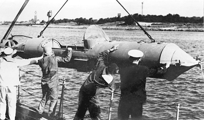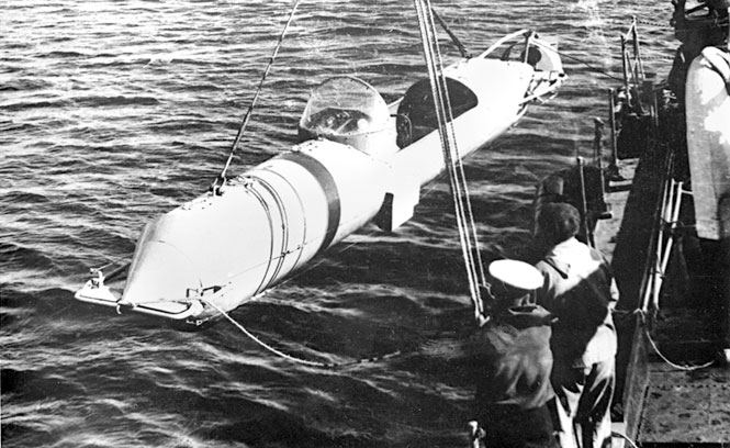 Спуск с корабля автономного двухместного носителя-транспортировщика водолазов-разведчиков Специальной разведки ВМФ СССР. Начало 60-х годов. (Фото из архива автора)