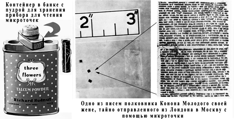 Кроме новейшего по тем временам радиопередатчика, для связи с Москвой в резидентуре Молодого активно применялась микрофотография. С ее помощью тексты с исходного документа формата A4 путем особого фотографического уменьшения размещались на крохотных чешуйках целлофана размерами около 1 ? 1 мм. Такие микрописьма назывались «микроточками», и резидент «Бен» использовал их даже в личных целях для переписки со своей женой, которая находилась в Москве и одна воспитывала детей. Можно было понять беспокойство о своей семье отца, выполнявшего секретные задания далеко от Родины. «Бен» поддерживал жену личными письмами, отправляемыми в такой необычной форме тайными путями в Москву.