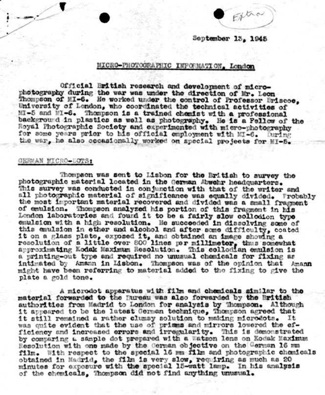 В годы войны Леон Томпсон руководил исследованиями в МИ-6 по микрофотографии под началом профессора Лондонского университета Бриско, координировавшего техническую деятельность МИ-5 и МИ-6. И потому Томпсон был признанным авторитетом по микрофотографии и методикам изготовления микроточек.