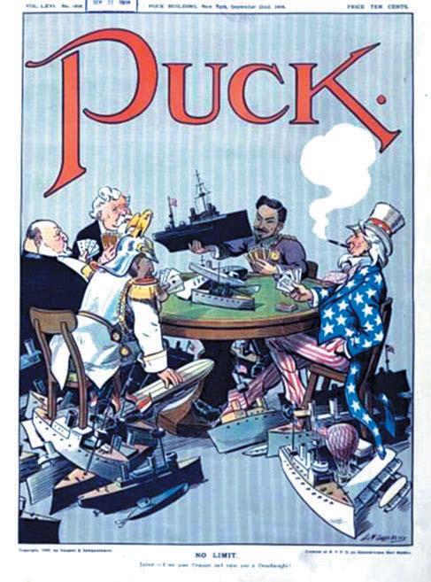 Журнальная карикатура – державы, участницы военно-морской гонки. 1909 г.