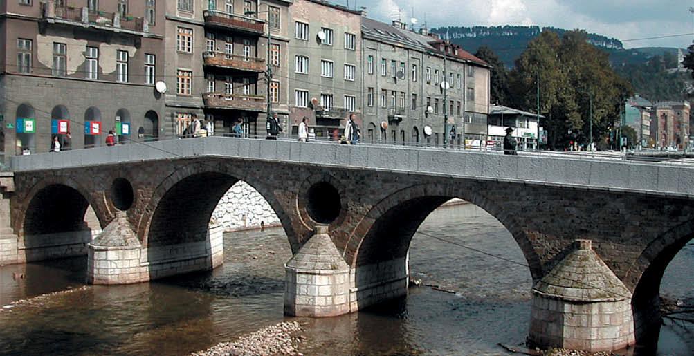 Латинский мост в Сараево и место убийство Франца-Фердинанда (в левой части снимка)