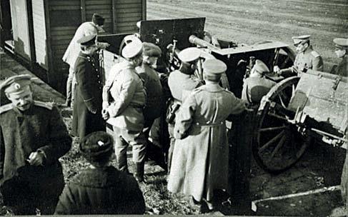 Русские офицеры осматривают орудия, оставленные австрийцами при отступлении. Галиция, октябрь 1914 г.