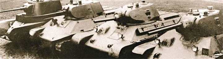 Довоенные танки производства Харьковского тракторного завода. Слева направо: легкий танк БТ-7М, опытный легкий танк А-20, средний танк Т-34-76 образца 1940 г. с пушкой Л-11 (1940 г.), Т-34-76 образца 1941 г. с пушкой Ф-34