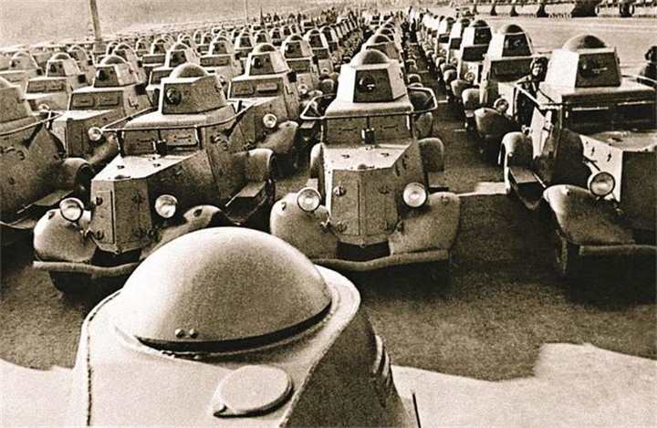 Легкие бронеавтомобили БА-20М на Манежной площади Москвы перед парадом 7 ноября 1940 г. Первый ряд составляют машины, оборудованные радиостанциями 71-ТК-1 с поручневой антенной