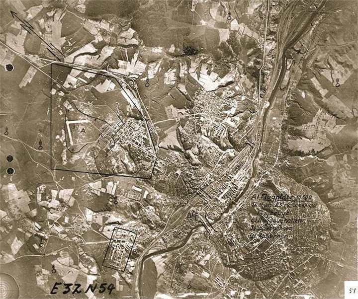 Аэрофотоснимок аэродрома Смоленск-1, сделанный самолетом-разведчиком Люфтваффе. Аэродром с ангарами и взлетно-посадочными полосами отмечен в левой верхней части снимка. На фотографии также указаны другие стратегические объекты: казармы (слева внизу, отмечены литерой «B»), крупные мосты, батареи зенитной артиллерии (вертикальная черта с кружком)