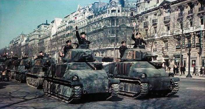 Трофейные французские танки 35S проходят в составе войск Вермахта по Елисейским Полям. Париж, 1 января 1941 года