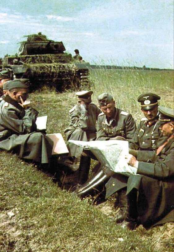 Гудериан совещается с генералами-командующими соединениями его группы. На фотографии справа налево: командующий 2-й танковой группой генерал-полковник Гейнц Гудериан (Heinz Wilhelm Guderian), командир 17-й танковой дивизии генерал-лейтенант Ганс-Юрген фон Арним (Hans-J?rgen Theodor Bernhard von Arnim), командующий 47-м моторизованным корпусом генерал танковых войск Иоахим Лемельзен (Joachim Lemelsen)