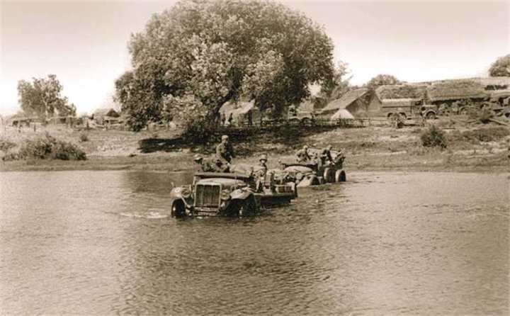 Немецкие автомобили из состава 2-й танковой группы вброд преодолевают реку в Белоруссии. Июнь-июль 1941 года. На переднем плане – 1-тонный полугусеничный тягач Sd.Kfz 10, на заднем – средний универсальный легковой внедорожник Pkw
