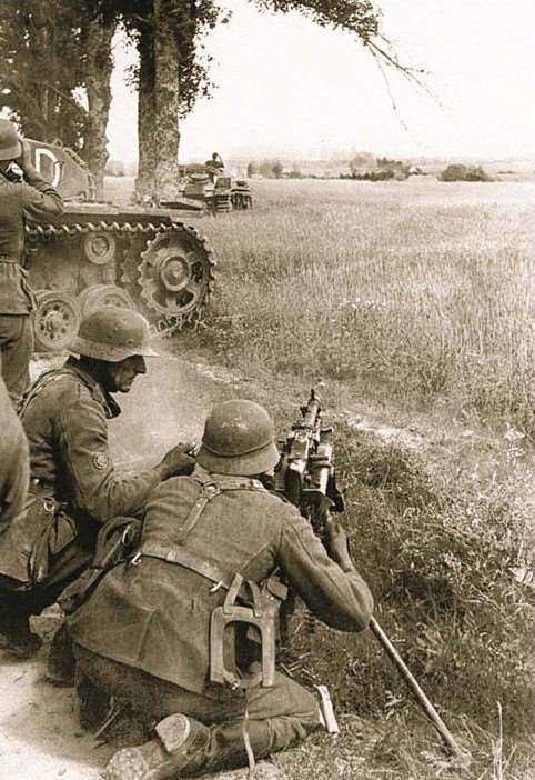 Пулеметный расчет немецких егерей из состава группы армий «Север» ведет огонь из пулемета MG-34. Лето 1941 года. Солдат прикрывает самоходно-артиллерийская установка StuG III