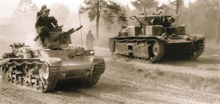 Немецкий легкий танк PzKpfw 35(t) 6-й танковой дивизии проезжает мимо брошенного советского командирского танка Т-28. Лето, 1941 г. 6-я танковая дивизия за три недели боев прошла более 800 километров: прорвала линию Сталина, форсировала Западную Двину, сражалась под Островом, форсировала Лугу, где остановилась, ожидая, пока подтянутся коммуникации и пехотные части. Наступление на Ленинград дивизия возобновила только 8 августа